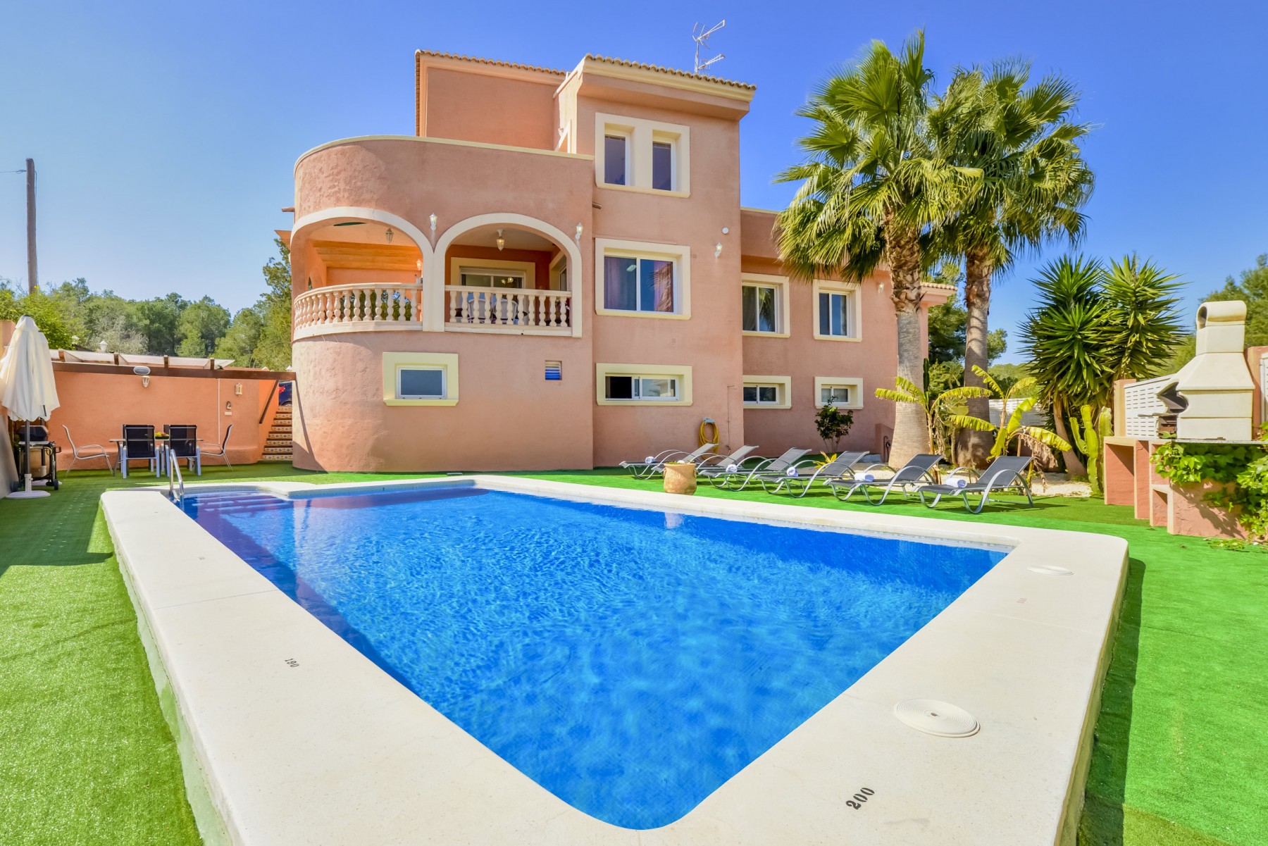EXTERNAL: Beautiful 8x4 pool with roman steps and a built-in barbecue. On the same property there is parking for 4 vehicles.